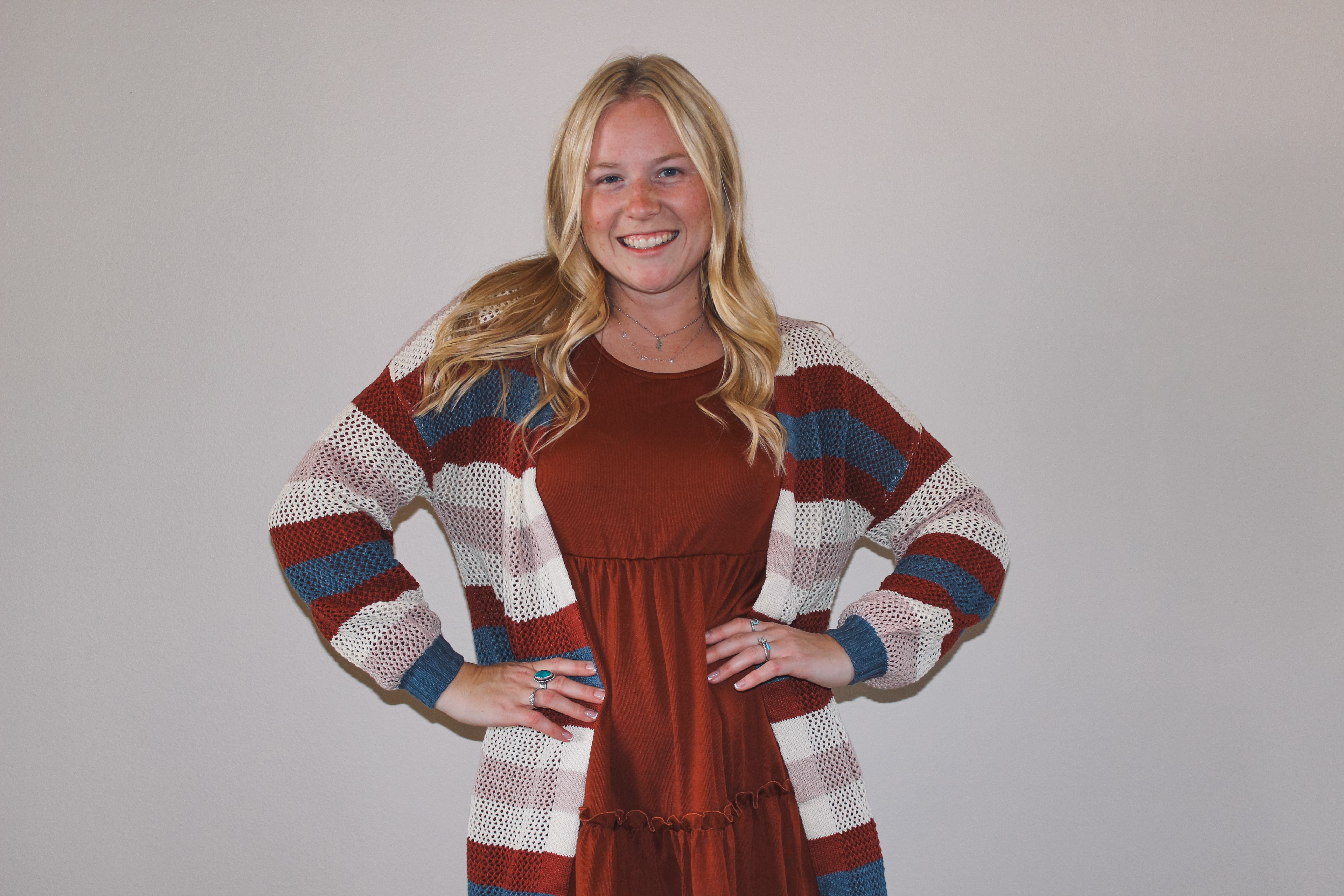 Our Knit Canyon Cardigan features stunning rust, blue, and beige tones inspired by desert canyons. This cozy knit cardigan is the perfect layering piece for fall—soft, stylish, and effortlessly boho with a western flair.